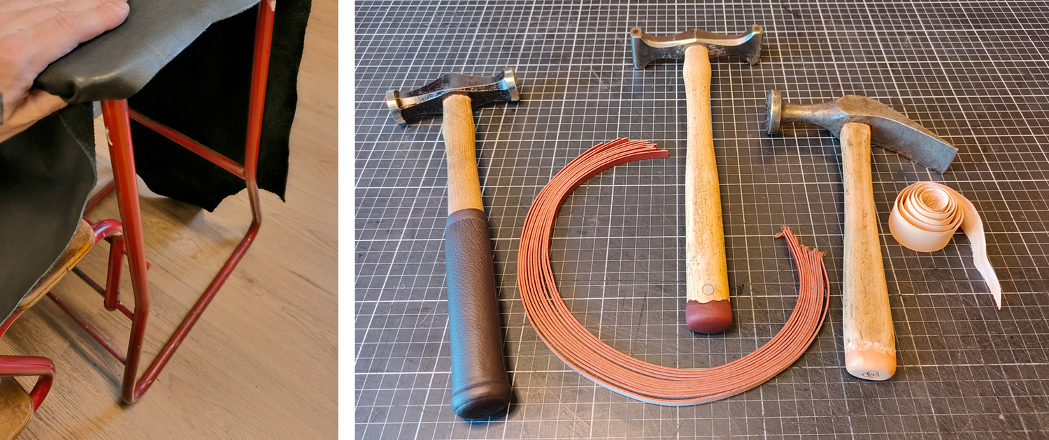 Här vill jag visa tre olika sätt att klä och snygga till handtag/handledare etc med läder, i detta fall blev det handtagen på tre hammarskaft.