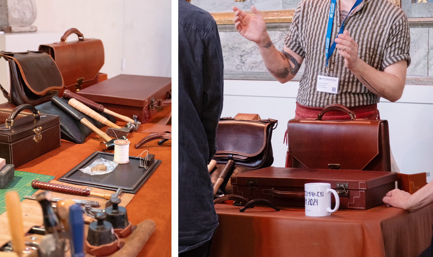 Jag är också utbildad väskmakare via Hantverksakademin och visar här även upp fyra väskor jag sytt under utbildningen. Två mjuka och två hårda väskor, alla sydda för hand.